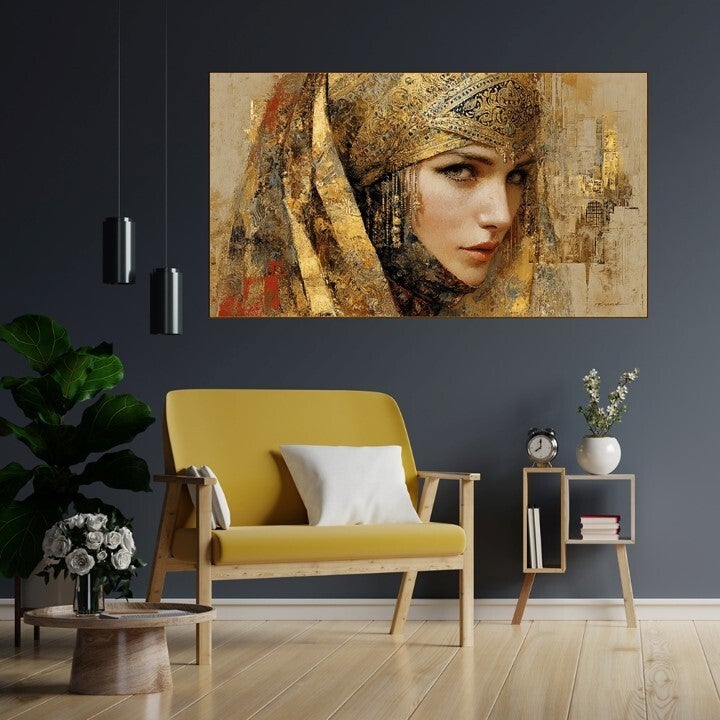 This mesmerizing poster features a Berber Desert Queen, her striking gaze emerging from a shroud of exquisite, textured gold. The fabric of her veil and garments shimmers with intricate, antique patterns that appear woven from sunlight and gold leaf. Set against a moody, earthen backdrop of ochre and shadow, the portrait evokes the timeless mystery and regal power of North African heritage, creating a cinematic, dramatically beautiful statement piece.💛